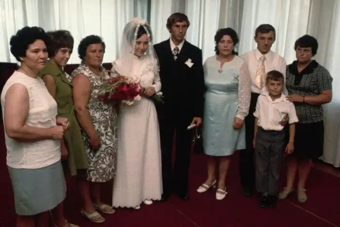 16. 1974 год. Молодожены с роднёй позируют для свадебной фотографии.