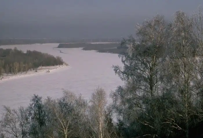 10. 1976 год. Лодки проплывают мимо жилых домов на берегу Обского моря.