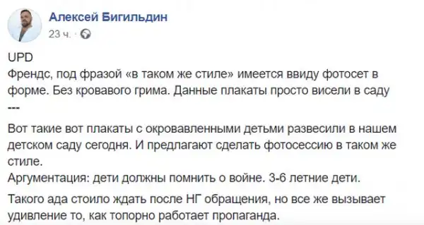 В одном из детских садов Москвы повесили плакаты в честь 75-летия победы. Казалось бы, что в этом плохо? Но дело в том, что на плакатах фигурируют маленькие дети в образе фронтовиков. Для пущей реалистичности, дети были измазаны кровью и грязью. Руководство дошкольного учреждения объяснило их появление тем, что "дети должны помнить о войне". На эти плакаты обратил внимание отец одного из детей Алексей Бигильдин. Он сфотографировал эти плакаты и опубликовал пост в Facebook. Увиденное он назвал полным "адом".