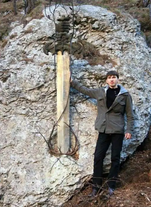 Так и меч, по легенде, был закован Мерлином в камень, когда он был совсем не твердым, но позже, со временем окаменел. Сегодня подобные мечи можно встретить во многих уголках планеты - некоторые просто сделаны в шутку, а некоторым буквально молятся, как иконам и верят, что тот, кто достанет его из камня станет будущим спасителем мира...