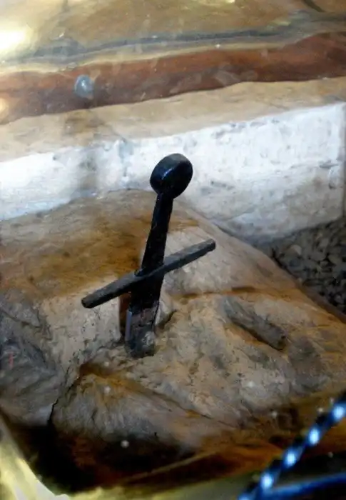 Этот меч считается настоящим и даже ученые установили, что он соответствует заявленному возрасту, однако узнать что под камнем запретила црковь