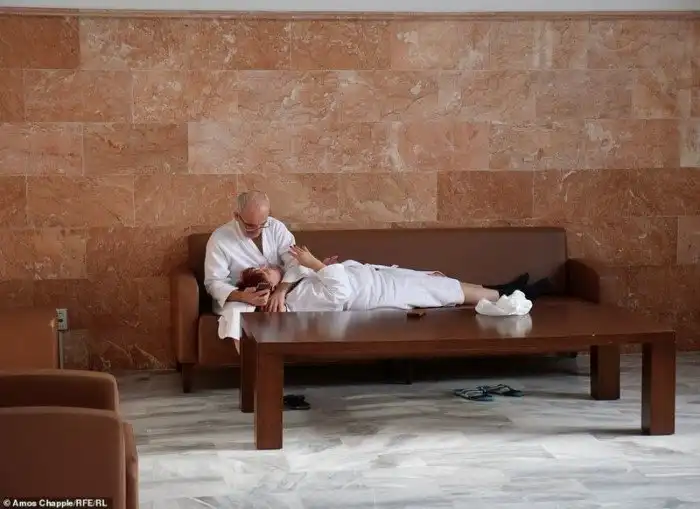 "В обжитых санаториях в комнатах семей есть телевизоры, уютная мебель - почти в точности как в квартире среднего класса в столице, Тбилиси. Уютные комнаты не имеют ничего общего с обветшалыми стенами самих зданий," - продолжает Чаппл. По городу до сих пор работает несколько лечебных спа-центров. Чаппл даже посетил один из них, где принял "горячую, вонючую грязевую ванну".