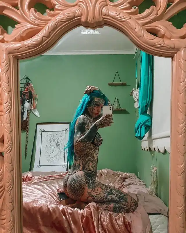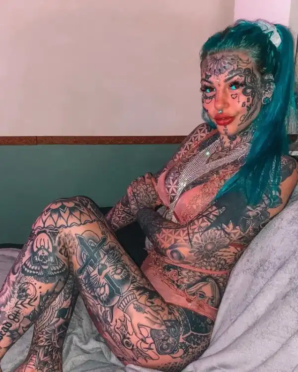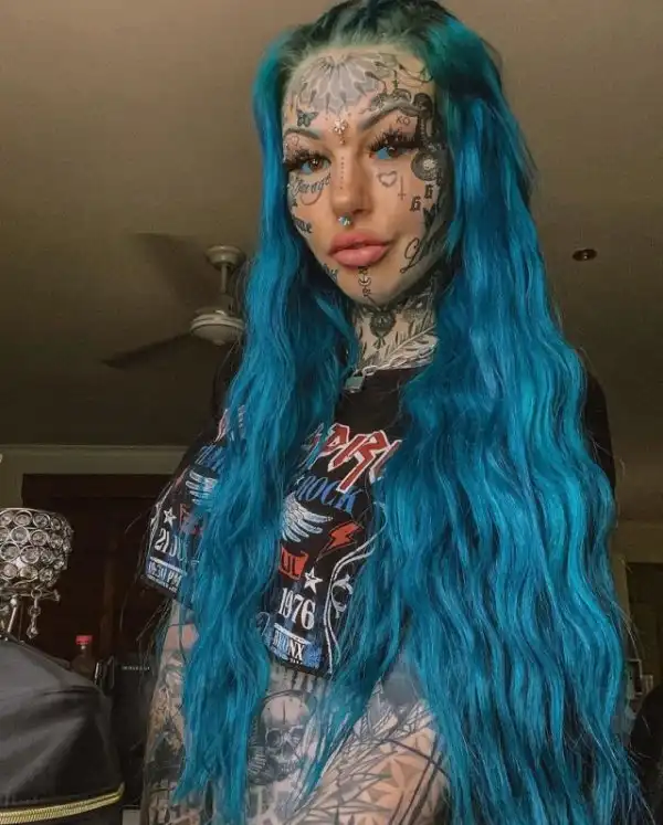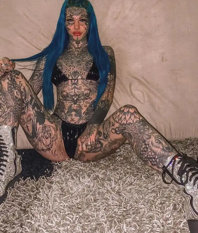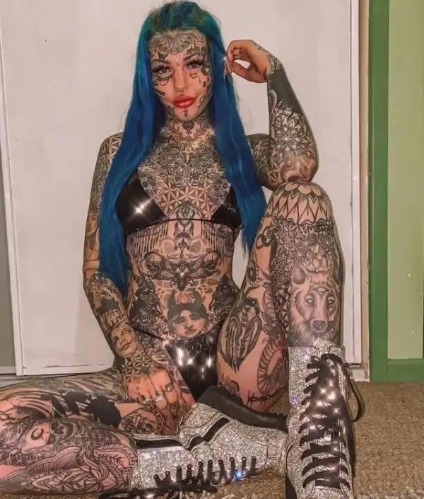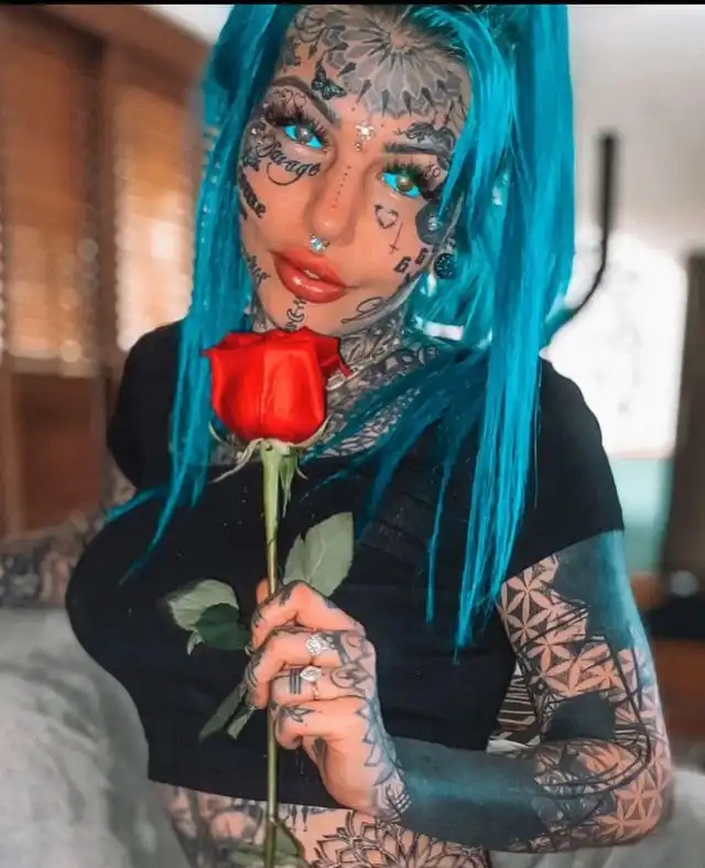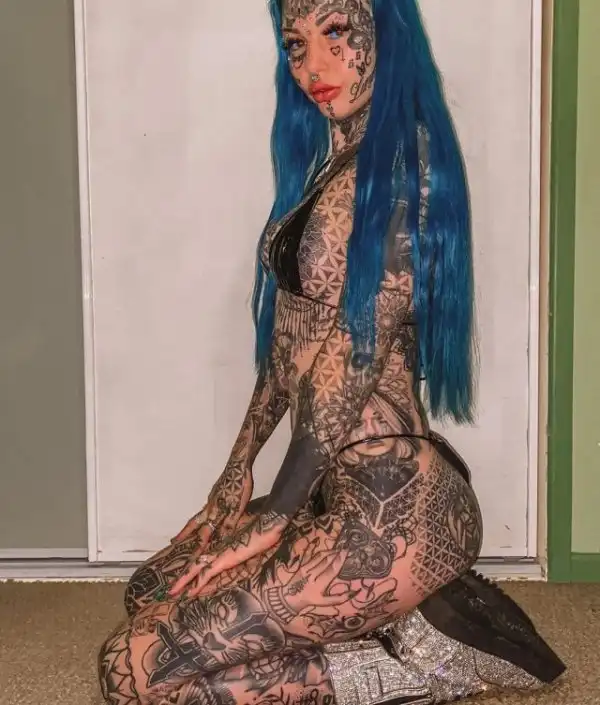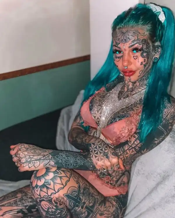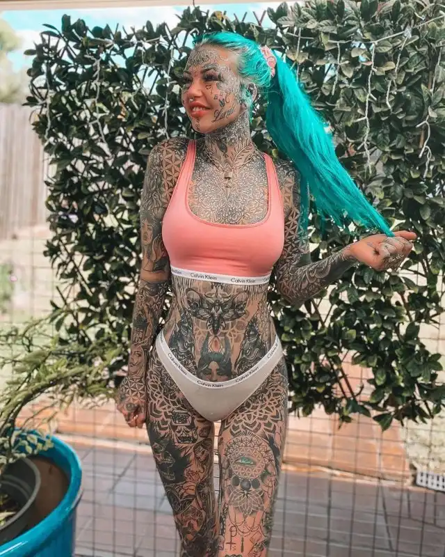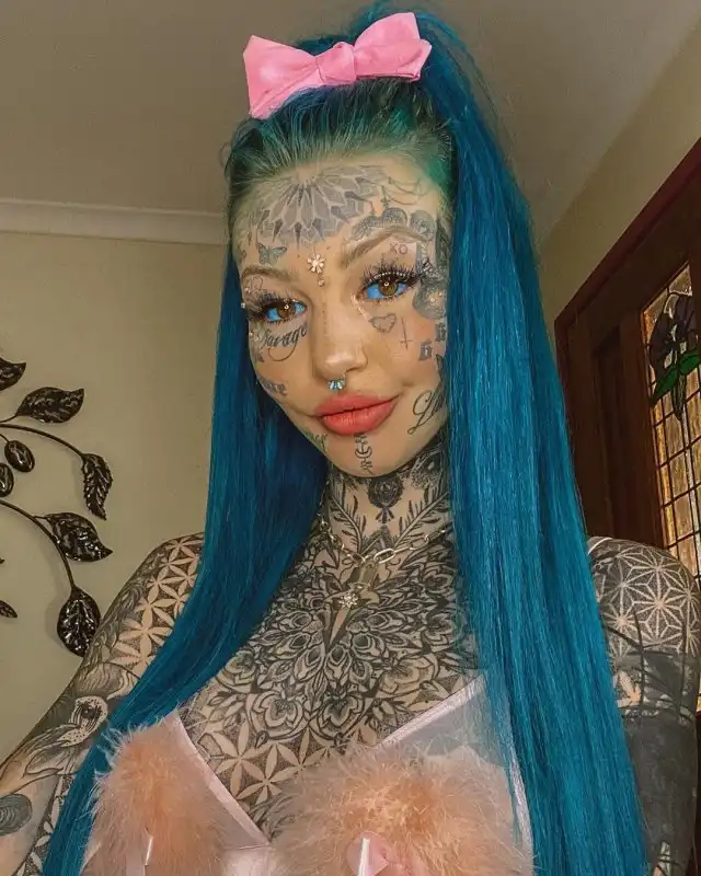 Эмбер сделала первую татуировку в виде каллиграфической надписи в 16 лет. Как известно, тату для некоторых людей - это своеобразный наркотик. Спустя 8 лет ее тело полностью покрыто дизайнерскими изображениями цветов, черепов и животных. Девушка закрасила и глаза. Теперь ее белки имеют синий оттенок. Также австралийка не забыла сделать себе раздвоенный язык и глазные импланты.