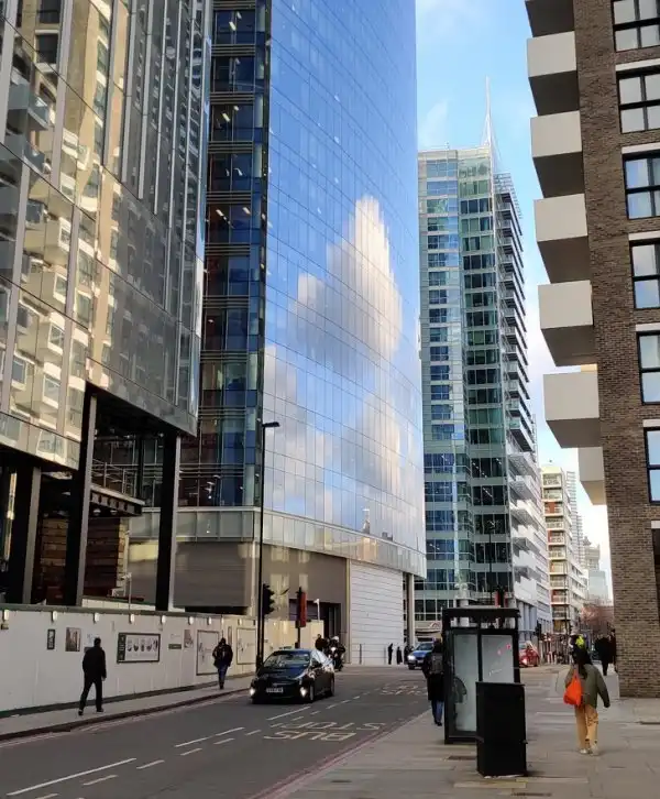 Отражение в здании разбило облака на пиксели