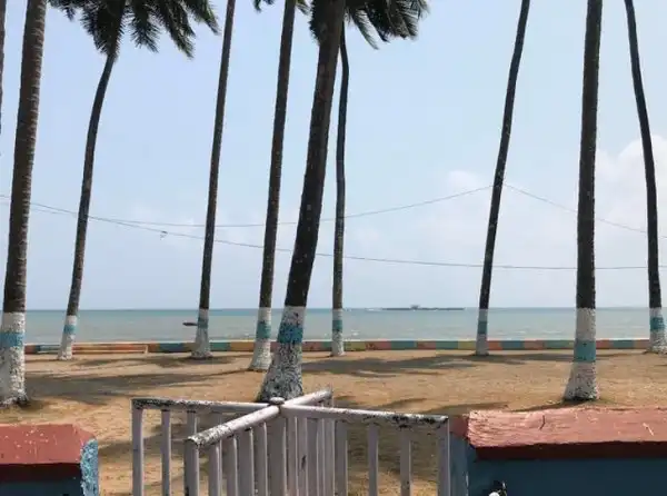 Покрашенные стволы пальм четко совпадают с линией моря