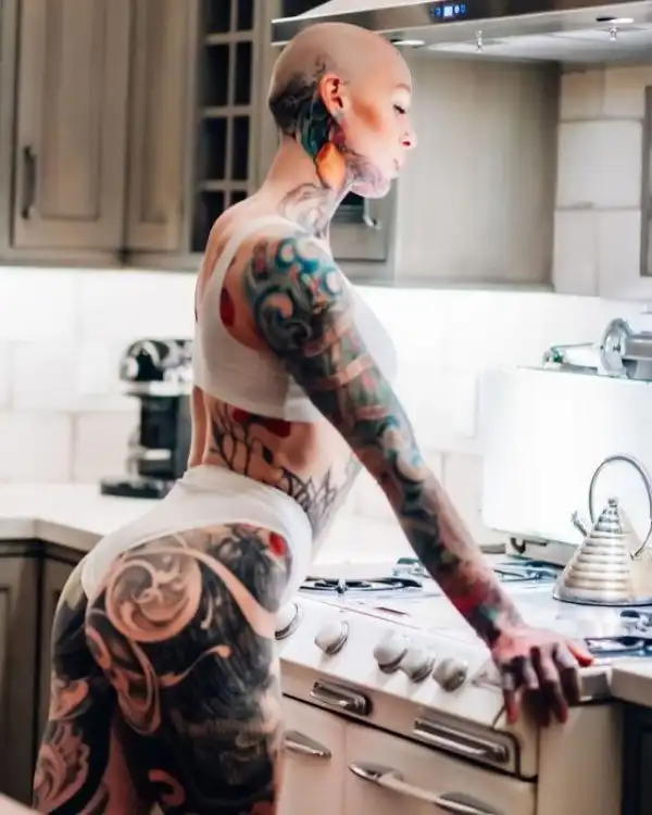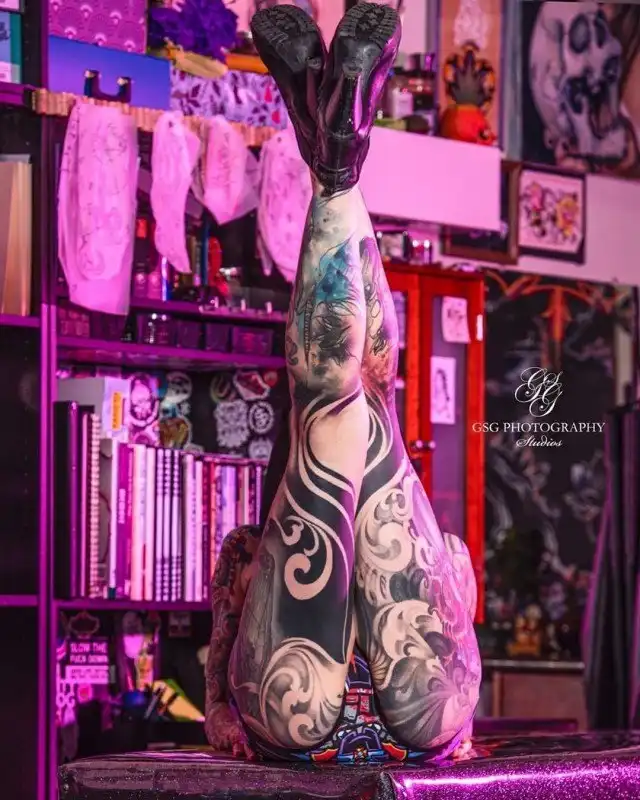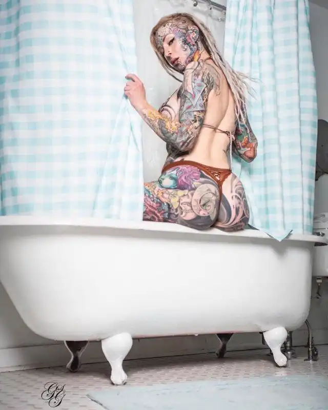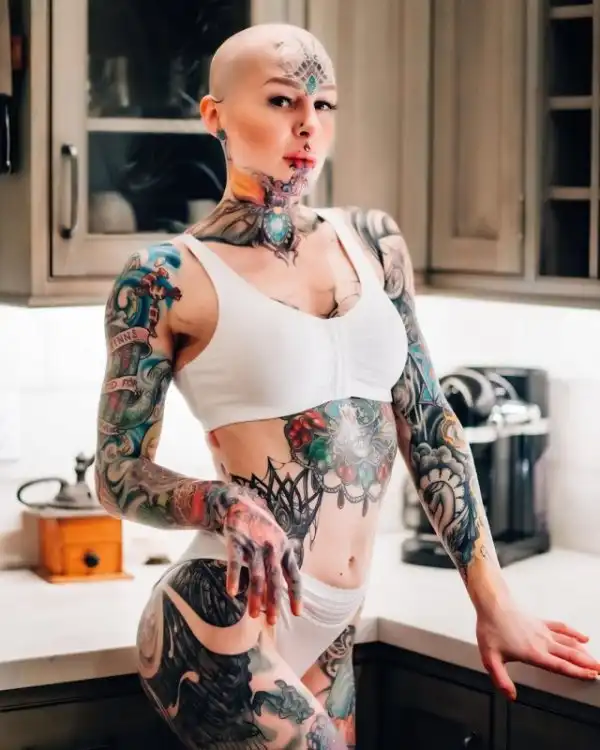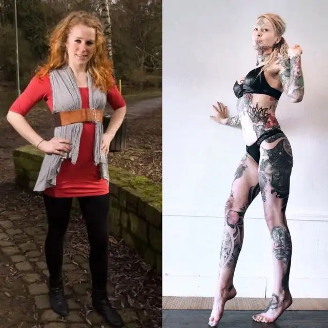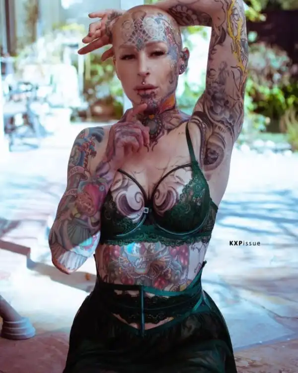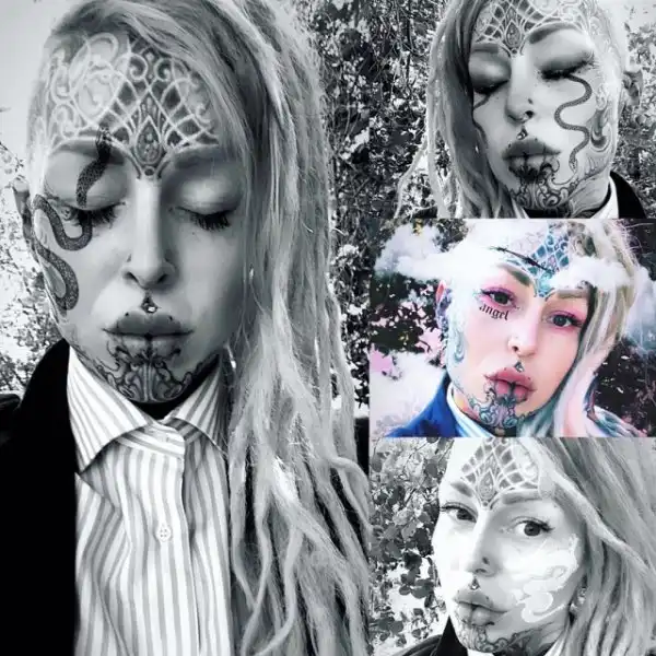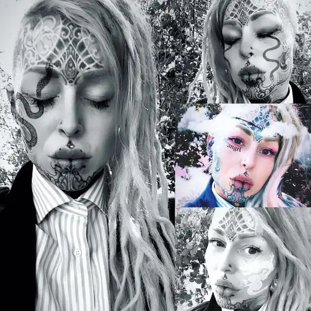 Немка Лина Л работала в области корпоративных технологий, но всегда мечтала стать “живым произведением искусства”. Первую татуировку она сделала в 2010 году, и теперь у нее более 50 татуировок по всему телу, включая голову и лицо. У Лины также вставлены грудные имплантаты, сделана хирургия носа, пирсинг, растянуты мочки ушей и бритая голова.