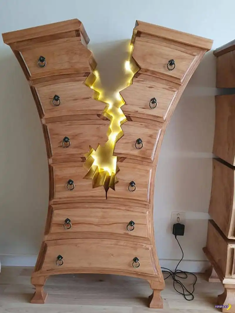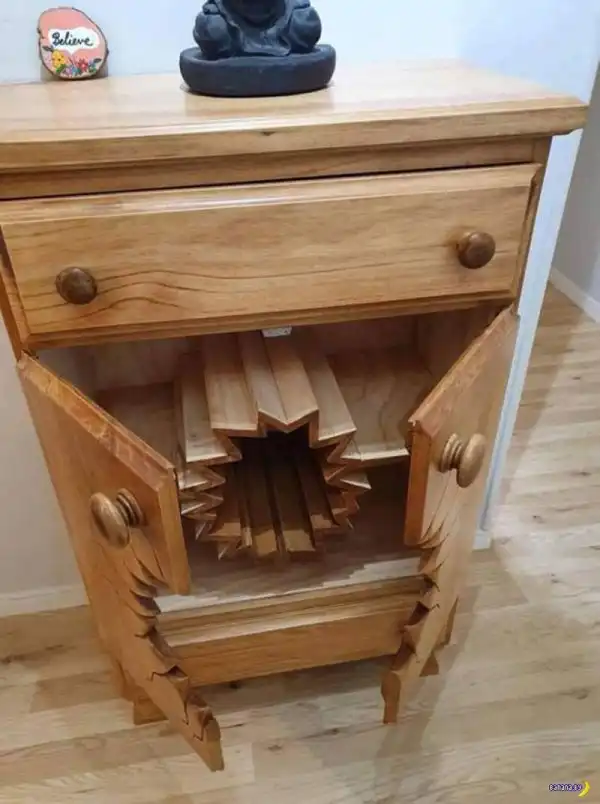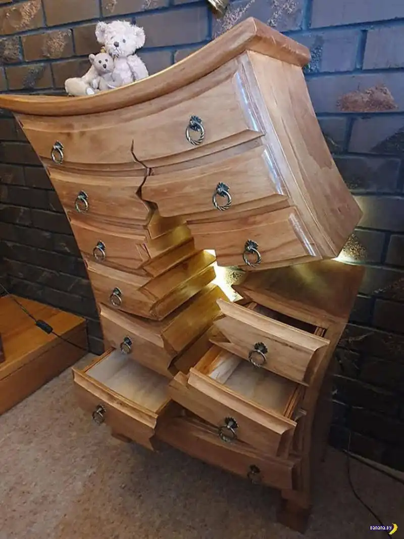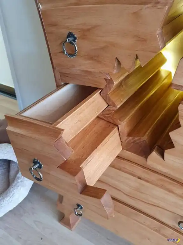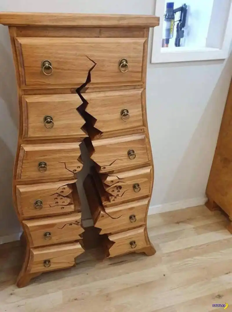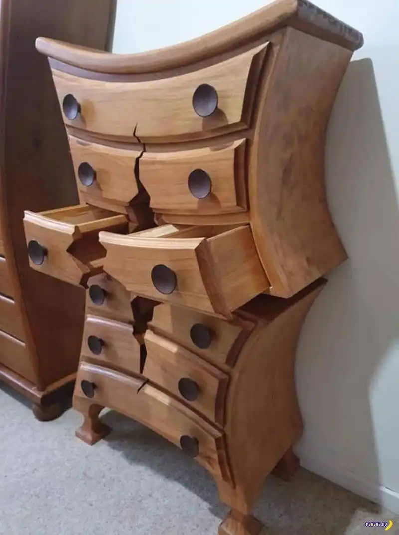 В среднем на один такой комод уходит 80-100 часов, сложная задача. Ну и когда в доме скопилось несколько готовых, их заприметила взрослая дочь Хэнка, сделала фотографии и разместила в Фейсбуке. Чем вызвала фурор. Теперь Хэнка все дёргают, трясут пачками наличных, просят сделать им под заказ что-то такое же. Интересно, что теперь пенсионер делая уродливую мебель просто в кайф, зарабатывает больше, чем работая на производстве.