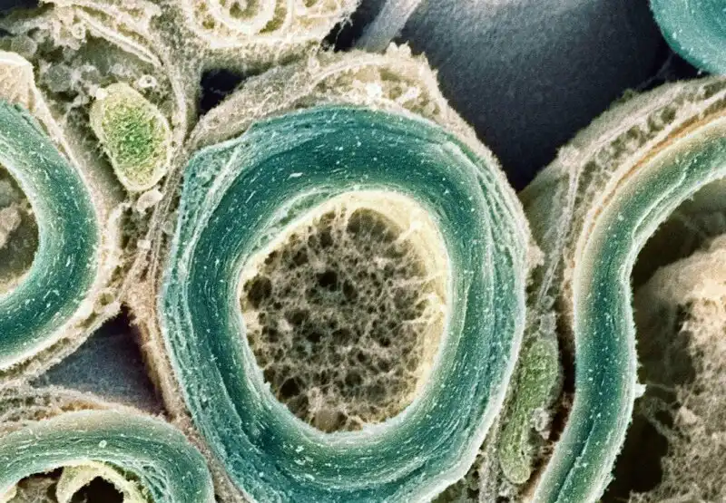 Миелин (зеленый) представляет собой изолирующий жировой слой, который окружает нервное волокно (аксон, черный), увеличивая скорость перемещения нервных импульсов. Он образуется, когда клетки Шванна (серые) обертываются вокруг волокна, осаждая слои миелина между каждой спиралью. Внешний слой состоит из цитоплазмы клетки Шванна и известен как нейролемма или оболочка Шванна.