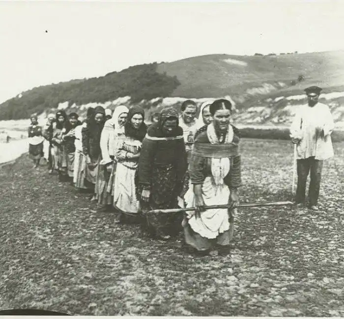 Женщины-бурлачки тянут баржу на реке Суре, 1910 год, Нижегородская губерния