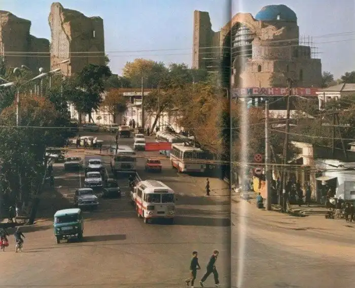 За перекрестком в центре Самарканда возвышаются руины мечети Биби-Ханум в строительных лесах