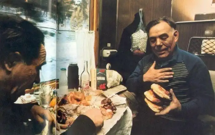 Ветеран Абрам Мордухович и действующий полковник Дмитрий Бояркин обедают в купе состава, несущегося по Транссибу