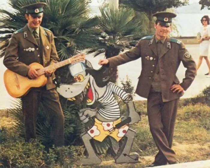 Солдаты в увольнении позируют с персонажем мультфильма