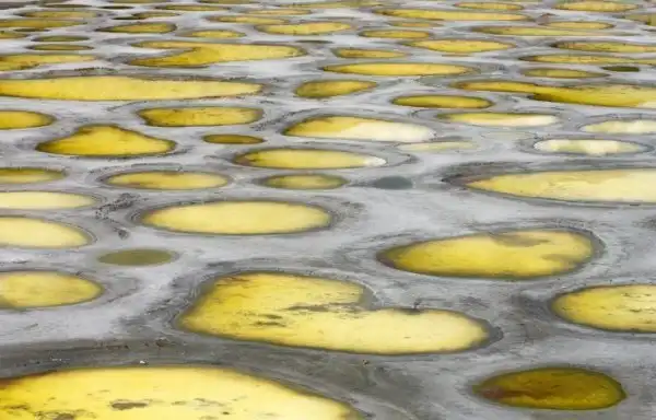 Это "Пятнистое озеро" в Канаде. Вода в этом нем испаряется, а из-за соляных отложений образуются почти инопланетные кратеры.