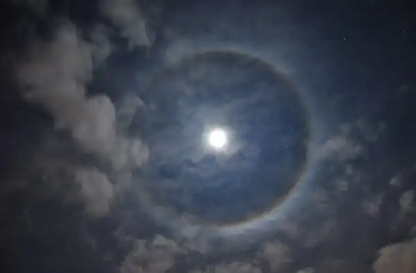 Лунное гало возникает, когда высокие облака с миллионом мелких кусочков льда покрывают большую часть неба.
