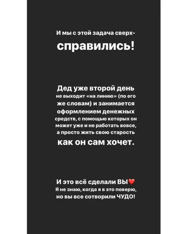 После публикации сториз – его стали репостить друзья и в какой-то момент ее посмотрело 40 тысяч человек. Историей поделились Алена Водонаева, участница «Ленинграда» Флорида и несколько других медийных персон. В итоге многие перевели ему небольшую сумму, и теперь дедушка, по его словам, может вообще не работать.