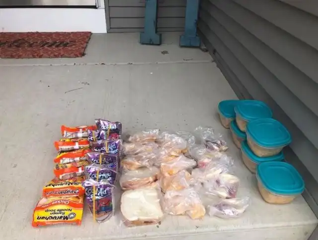 Женщина оставляет на крыльце детские обеды тем, кто в них нуждается. Малышам с аллергией на арахис — в отдельных помеченных контейнерах.