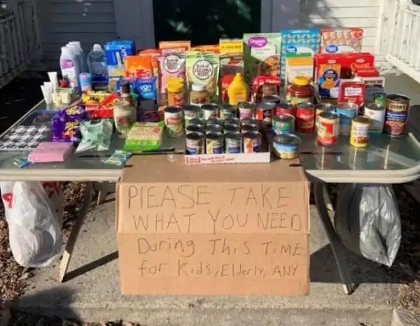 Мужчина поставил стол с необходимыми продуктами для тех, кто в них нуждается.