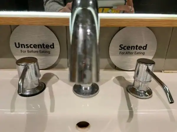 Кран, в котором есть средства для чистки рук - слева без запаха, справа - с запахом