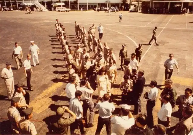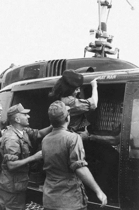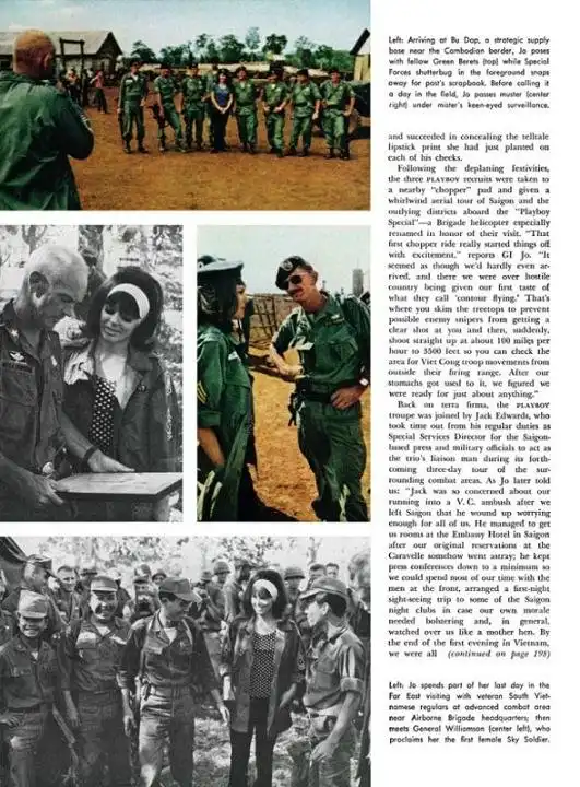 Уже 9 января 1966-го "Плэймейт-65" и её немногочисленная свита (рекламный координатор Джойси Чалески и фотограф Ларри Гордон), малость офигевшие после восемнадцатичасового перелета, высадились в Сайгоне на авиабазе Tan Son Nhut, где их встречали больше четырехсот человек - особой тайны из этого визита никто не делал.