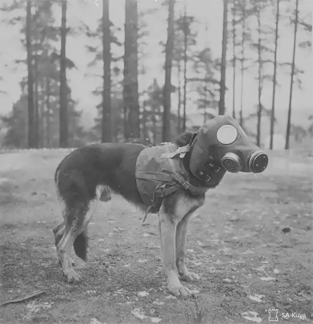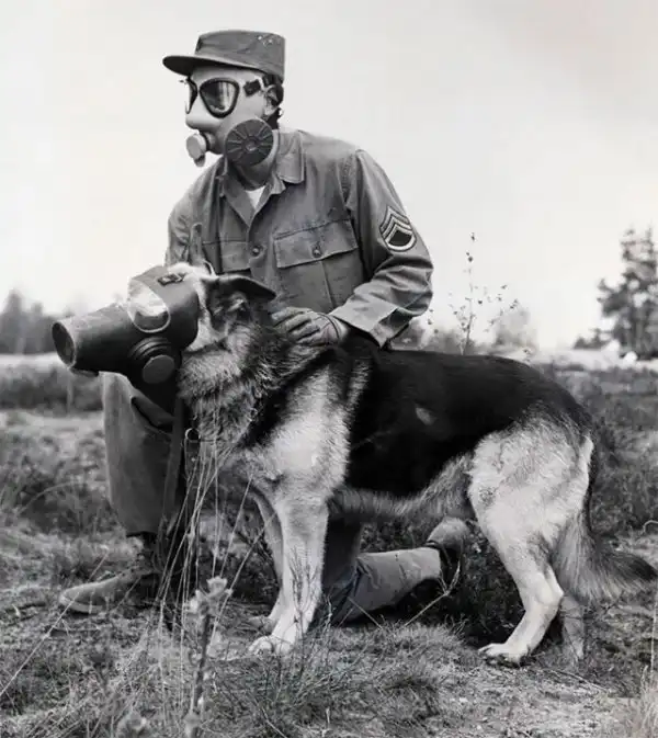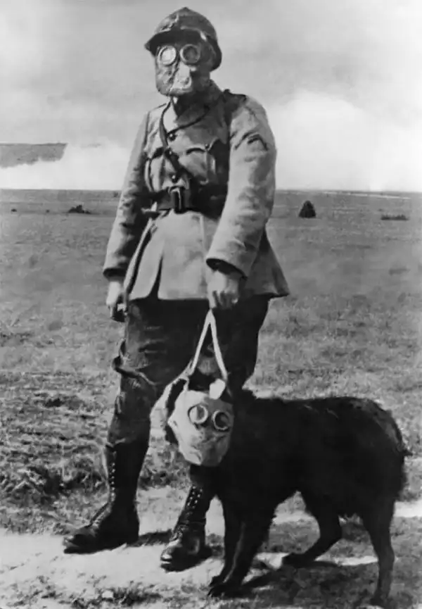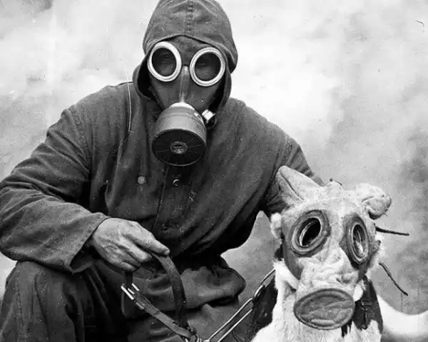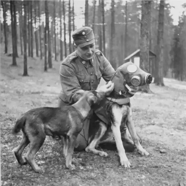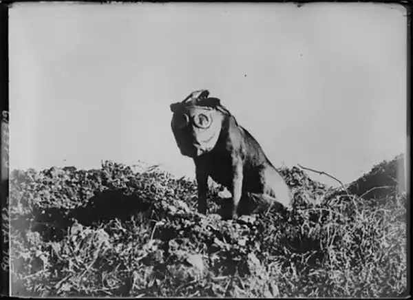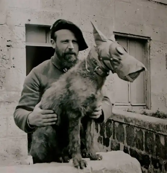 Первая Мировая война унесла жизни не только миллионов людей, но и различных животных - включая собак. Псы были верными друзьями солдат и помогали им на полях сражений. Использовали их и медики - для переноски лекарственных препаратов и оборудования. Однако стоит помнить, что в те годы довольно часто использовалось химическое оружие. Поэтому приходилось использовать различные противогазы. Но солдаты защищали не только себя, но и своих напарников - собак. В наши дни увидеть человека в противогазе - это не удивительно. Но вот собаки в старинных противогазах выглядят довольно зловеще.