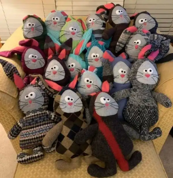 Женщина связала кроликов из старых свитеров.