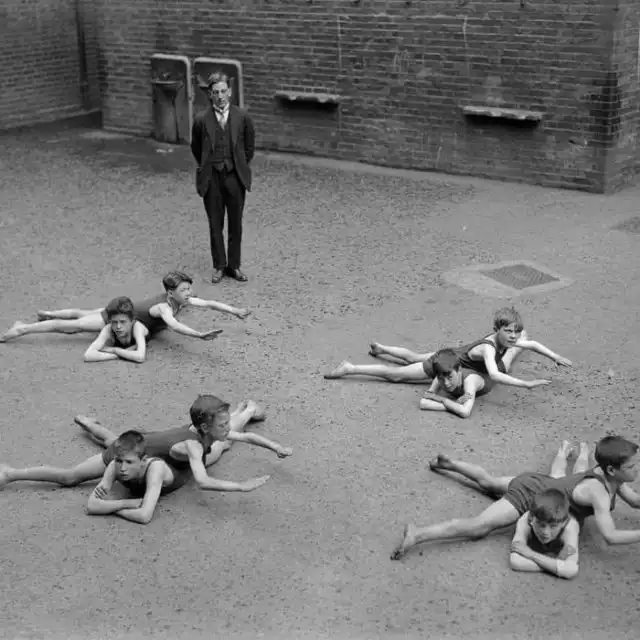 Обучение плаванию на школьном дворе. Великобритания, 1920–е гг