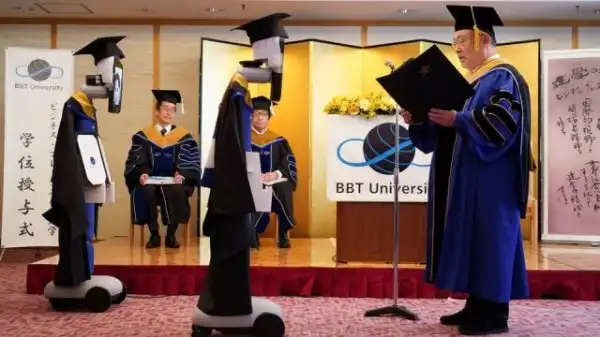 Одна из компаний, производящих роботов, предоставила образовательному учреждению несколько своих аппаратов. И так студенты смогли получить свой дипломы удаленно. Смотрится это все довольно забавно.