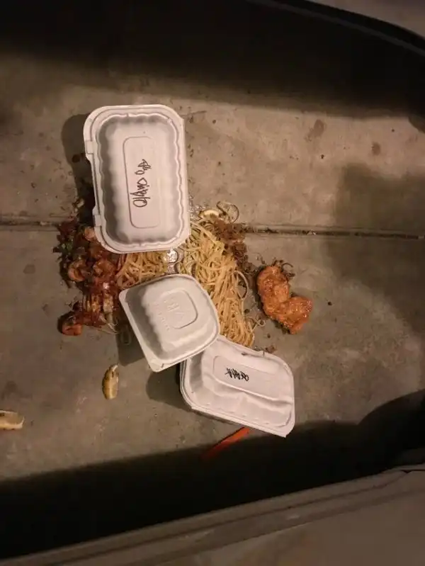 Съездил за ужином в местный ресторан… соус протек, сумка порвалась, ужин поздоровался с полом в гараже