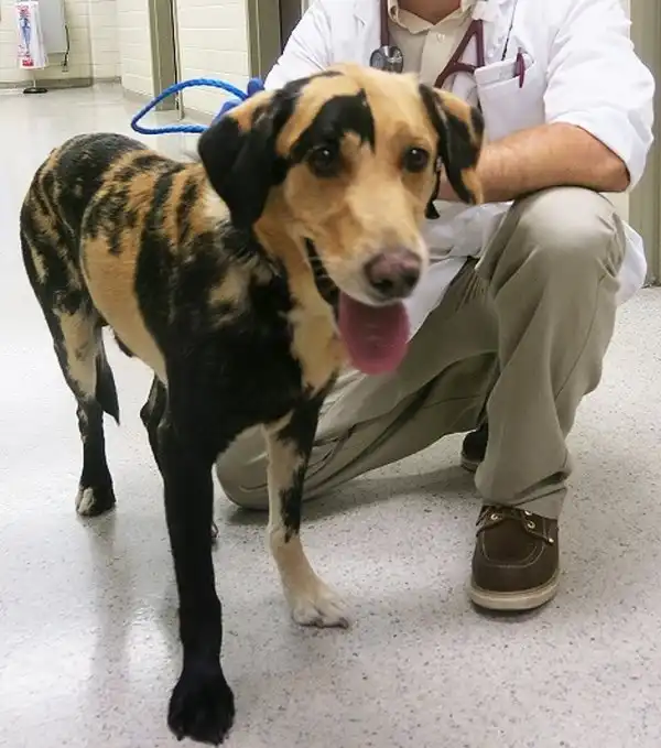 Собака - химера, сочетание двух генетически разных мастей: черной и желтой