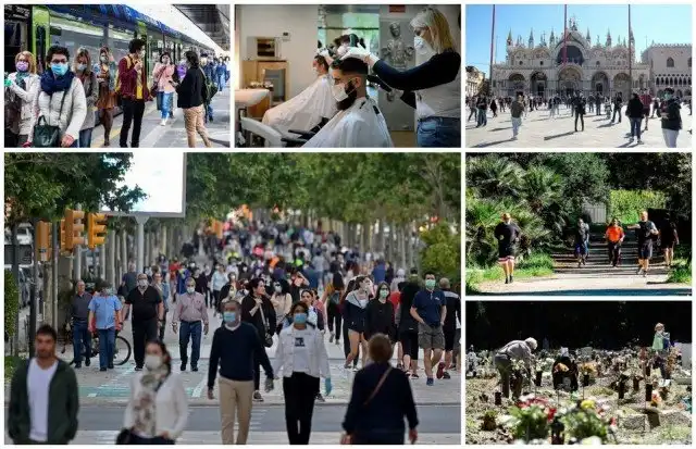 Впервые за девять недель люди могут выйти на улицы в Италии, так как заболеваемость коронавирусом пошла на спад. Открылись парки, рестораны, разрешено посещать родственников. Возобновляется работа заводов и строительных площадок. Тысячи детей вернулись в школы Германии, где старшим детям уделяется приоритетное внимание, поскольку они готовятся к экзаменам. В Португалии отменили чрезвычайное положение и разрешили вновь открывать небольшие магазины и парикмахерские. Людям рекомендуют соблюдать социальную дистанцию, носить маски и перчатки. За нахождение без маски в общественном месте штраф 350 евро.