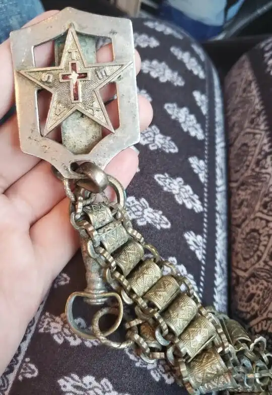 Это атрибутика масонов Великой Техасской ложи. В Техасе вообще часто используют символ креста. Конкретно эта вещица - перевязь для холодного оружия.
