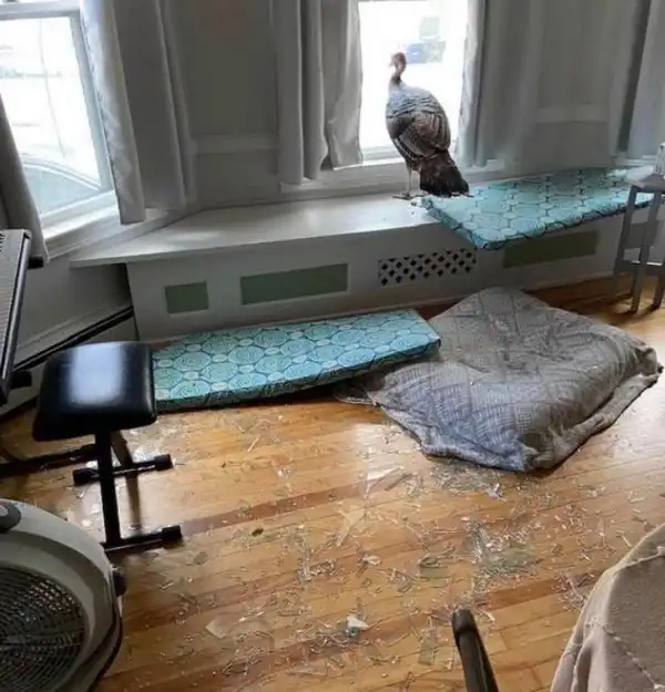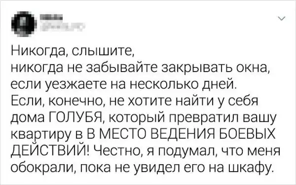 "Закрывайте окна перед тем как выйти из дома. Никогда не знаешь, когда в квартиру залетит дикий индюк и разнесет все к чертовой бабушке!"