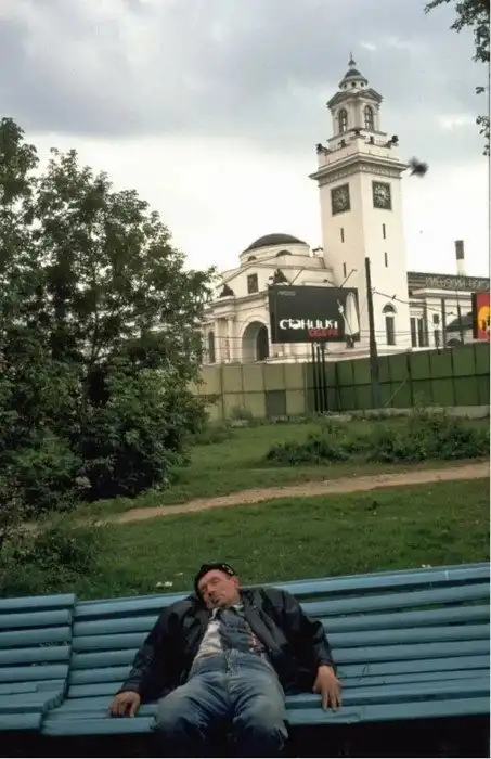 14. Отдых на скамейке у Киевского вокзала. Москва, 1998 год.
