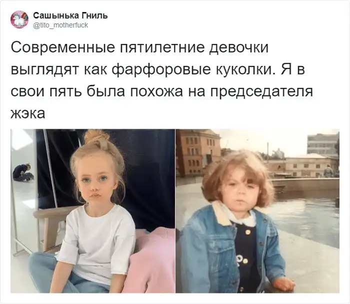 Вы когда-нибудь задумывались, как по-разному выглядят на фото дети раньше и сейчас? А вот пользовательница Твиттера «Сашынька Гниль» задумалась.