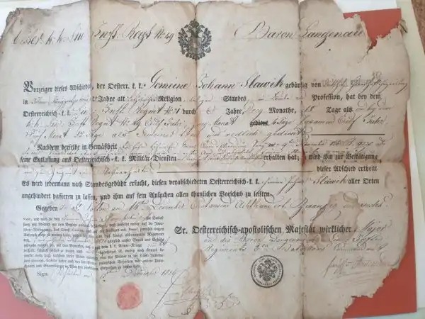 Ответ: Садитесь поудобней, теста будет много. Перед вами официальное письмо об освобождении богемского солдата по имени Иоганн Славик из армии Австрийской Империи после 11 лет, 5 месяцев и 22 дней службы в двух разных пехотных полках. Документ написан 15 декабря 1826 года. .