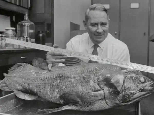 Ученый измеряет чучело латимерии, вымершей 65 миллионов лет назад, США, 1968 год