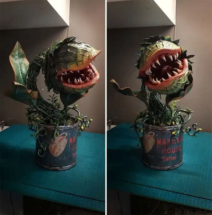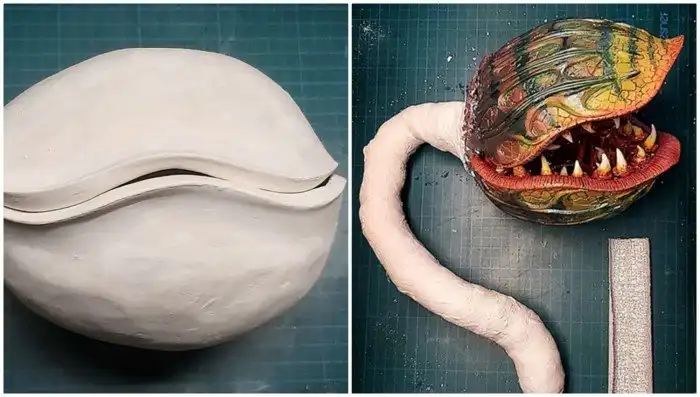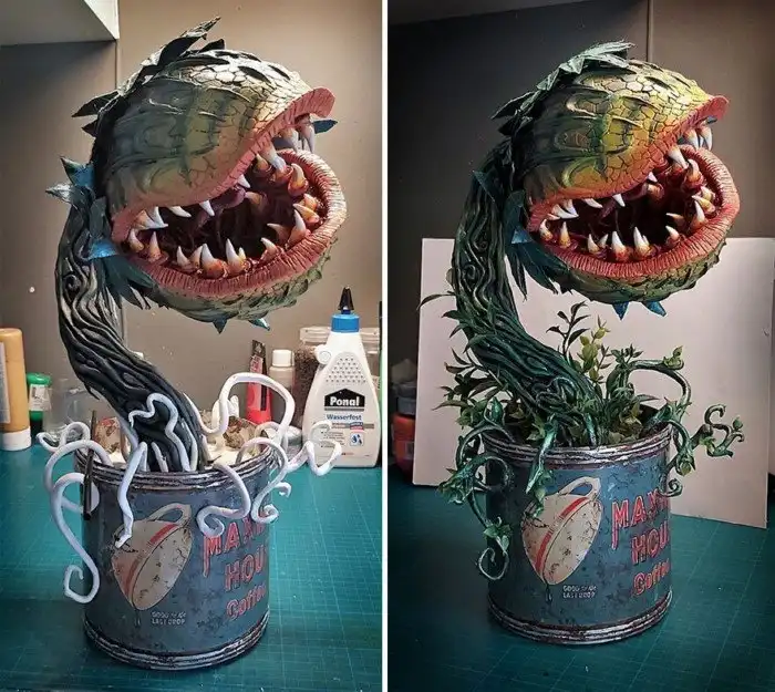 Вдохновившись старым фильмом, Кассиопея решила создать свою Одри. "Так как все магазины сейчас закрыты, для создания Одри я использовала материалы, которые были у меня дома: старый цветочный горшок, фарфоровое яйцо, гипс, глину, краску и разные старые украшения," - пишет девушка.