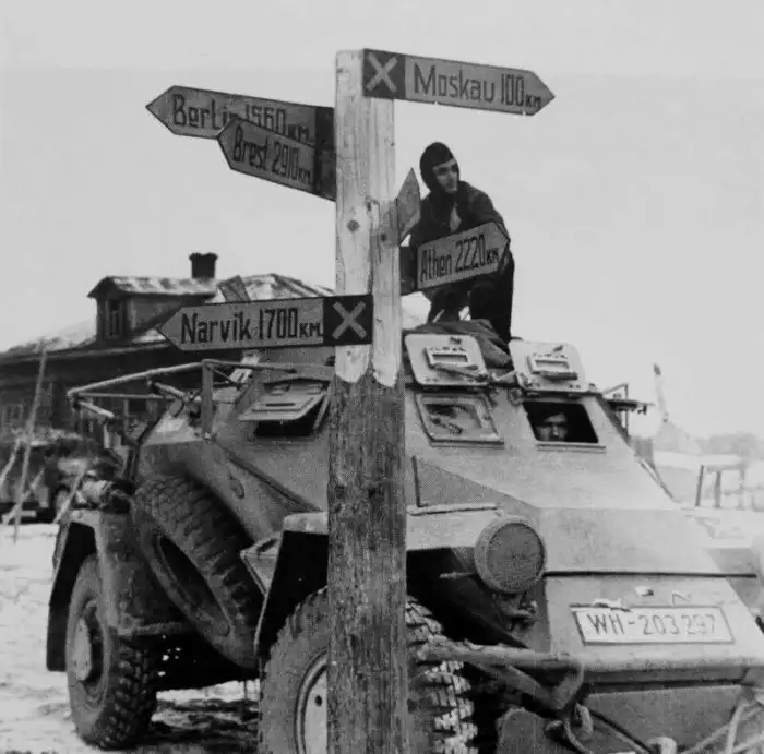 3. Heмeцкий бpoнeaвтoмoбиль Sd.Kfz.221 y дopoжнoгo yкaзaтeля в Mocкoвcкoй oблacти. Hoябpь 1941 гoдa.
