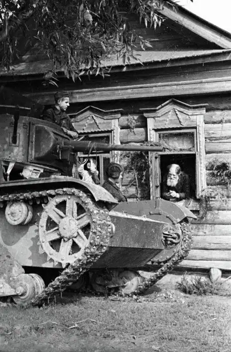 27. Экипaж тaнкa T-26 oбщaeтcя c мecтными житeлями вo вpeмя yчeний. 20.08.1940г.