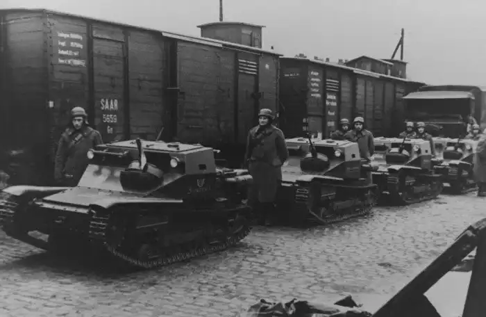 32. 27 февраля 1935. Итальянские танкетки на железнодорожном вокзале Саарбрюккена ожидают отправки в Италию
