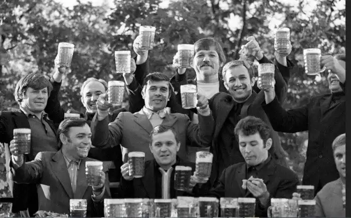 34. Бригада шахтеров пьет пиво во время отдыха. Донецкая область, Украина 01.07.1977 г.