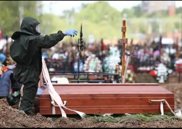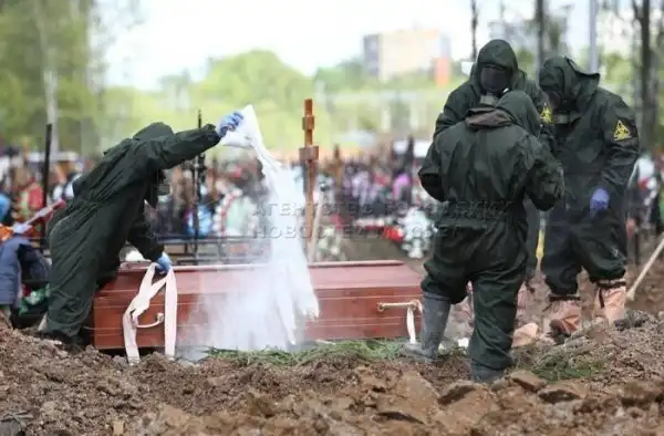 В связи с распространением инфекции погибших от нее хоронят (по рекомендации Минздрава) в закрытых гробах и с минимальным присутствием провожающих в последний путь. Как это выглядит...