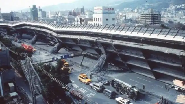 Рухнувшая во время землетрясения автострада в городе Кобе, 1995 год, Япония