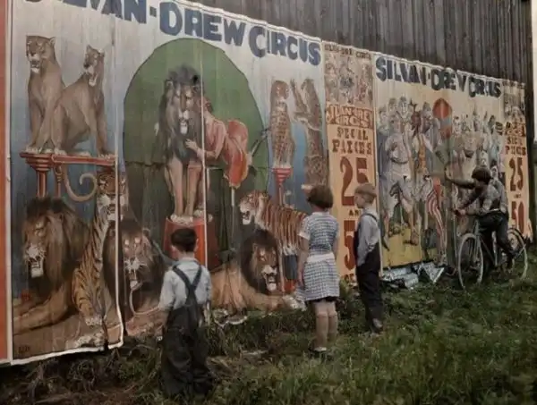 Дети рассматривают афиши цирка Sylvan Drew, 1931 год, США