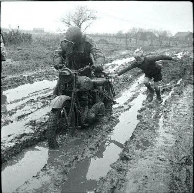 Голландский мальчик помогает выбраться из грязи британскому военному почтальону. 11 декабря 1944 года.