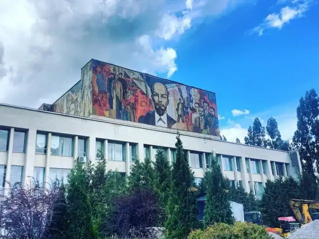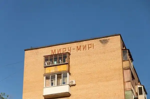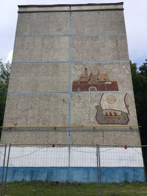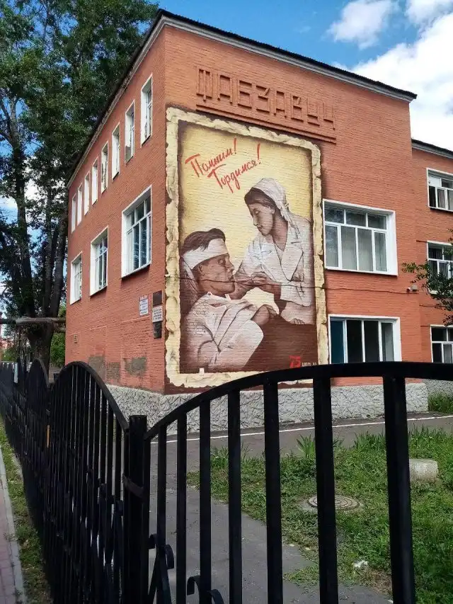 Выложенный кирпичами лозунг на торце типовой девятиэтажки в московском районе Богородское