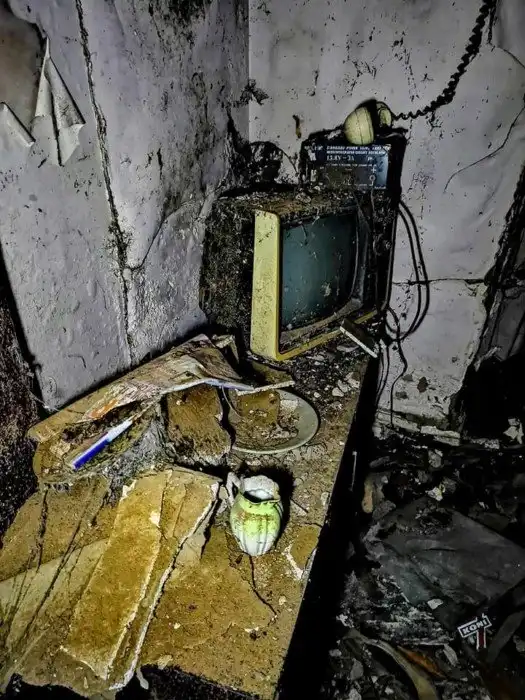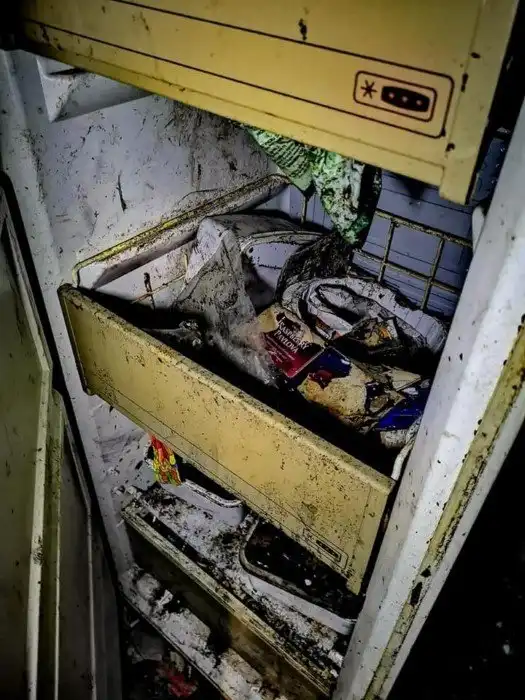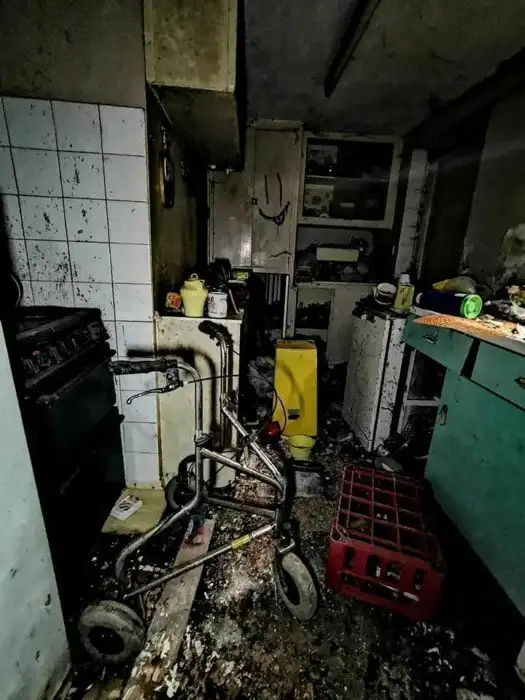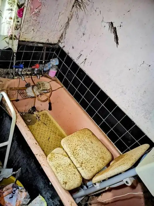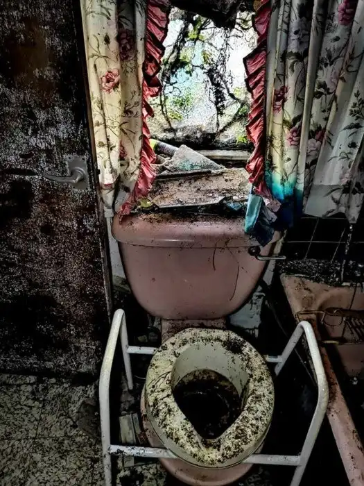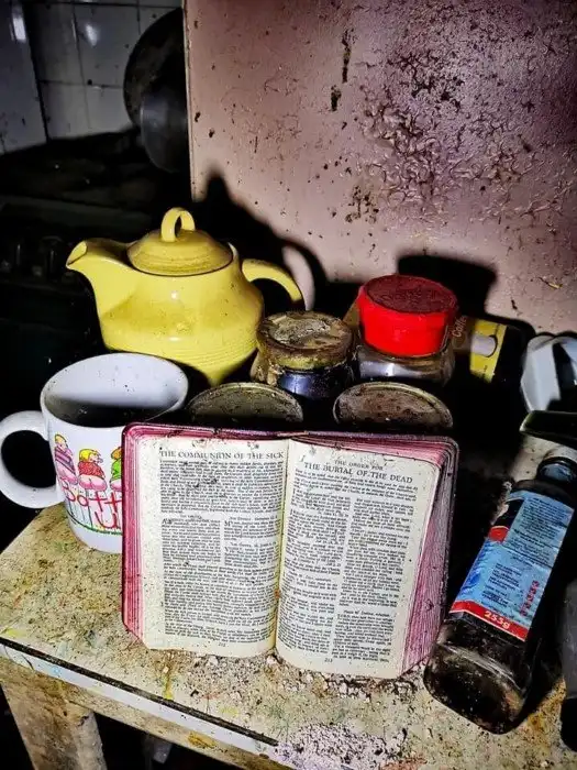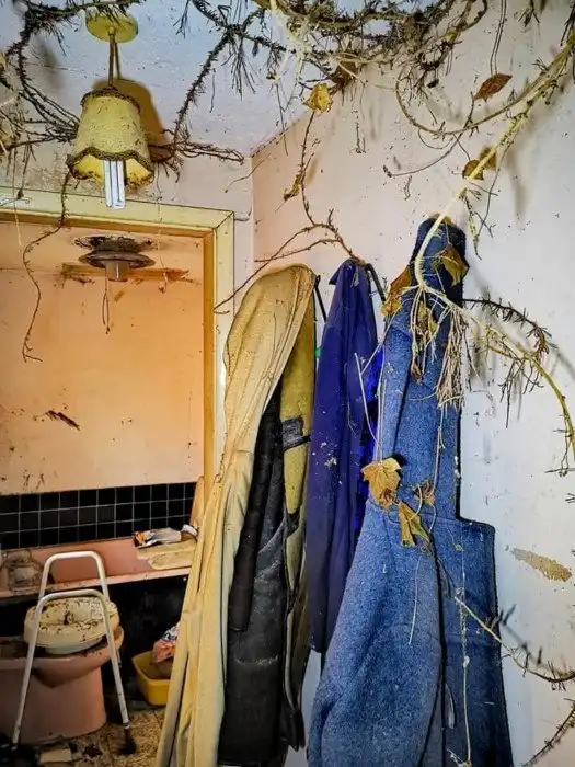В шкафу сохранилась одежда, на кухне — ходунки, а в ванной — вставная челюсть бывшей владелицы дома. 86-летняя женщина умерла в 2003 году, и с тех пор дом стоит заброшенным.