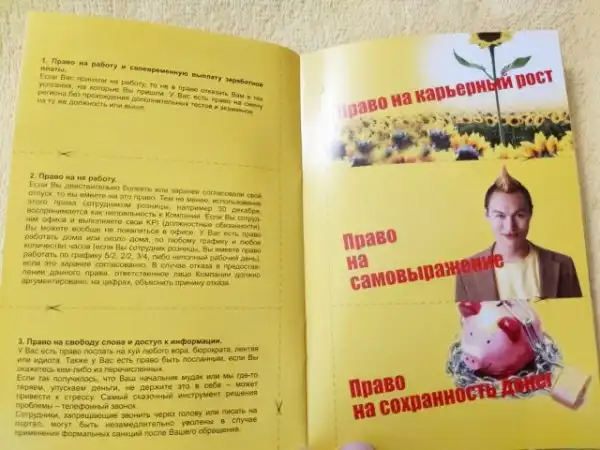 Это брошюра Билль о правах и понятиях, которую выдавали каждому новому сотруднику в районе двухтысячных. Что-то вроде устава компании, но с абсолютно неформальной (для некоторых – ненормальной) подачей каждого факта.