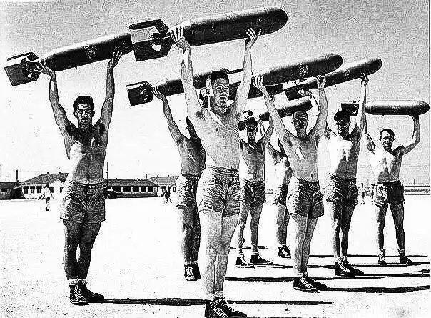 Ежедневная утренняя зарядка бомбардиров, со 100-фунтовыми бомбами. США, 1943 год.