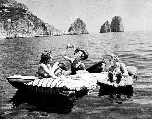 Девушки загорают и едят спагетти на надувных матрасах. Остров Капри, 1939 год.